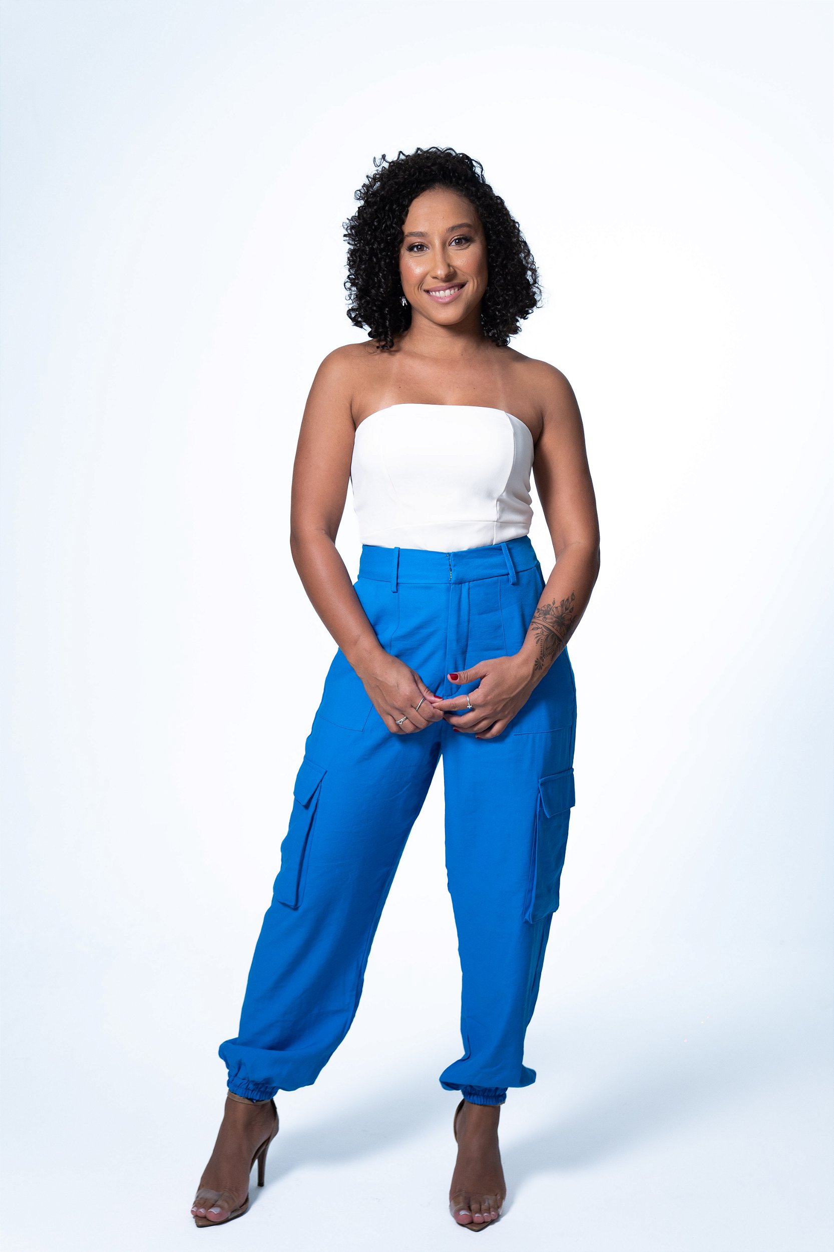 Detalhes da Peça: Calça desenvolvida em tecido alfaiataria, com bolsos cargos laterais e elástico na barra.