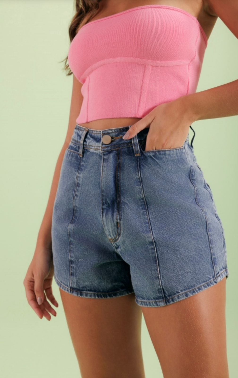 Detalhes da Peça: Short desenvolvido em tecido jeans com modelagem de cintura alta. Possui recortes frontais e bolsos frontais retos.